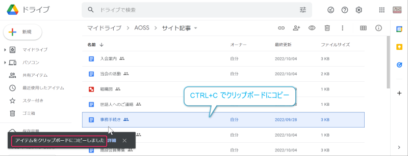 ちなみに、アドレスバーからだけでなく、ファイルを選択して CTRL+C (Windows) もしくは COMMAND + C (Mac) しても URL がクリップボードにコピーされます。