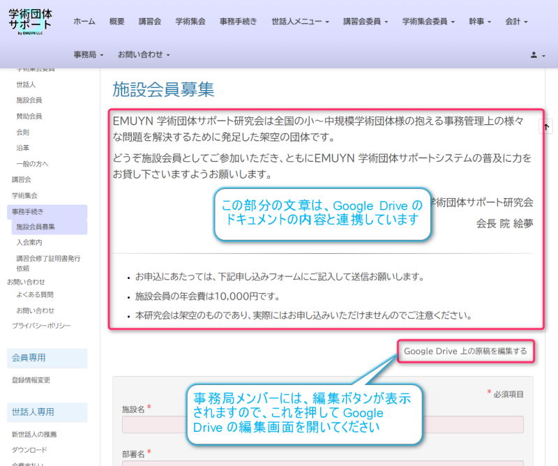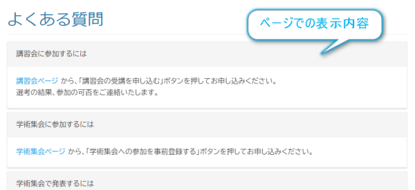 各学術団体様の事務局メンバーおよび各々のページの担当者には、 頻繁に書き換える部分 だけを間接的に修正していただきます。 学術集会の開催案内や、役員の一覧などがその部分に当たります。