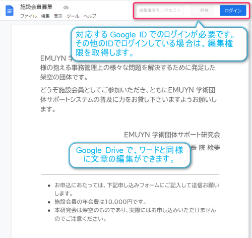 事務局メンバーは、連携している Google ID にてログインして、 編集作業を行ってください。 そうすればファイルの所有者ですので自由に編集ができます。
