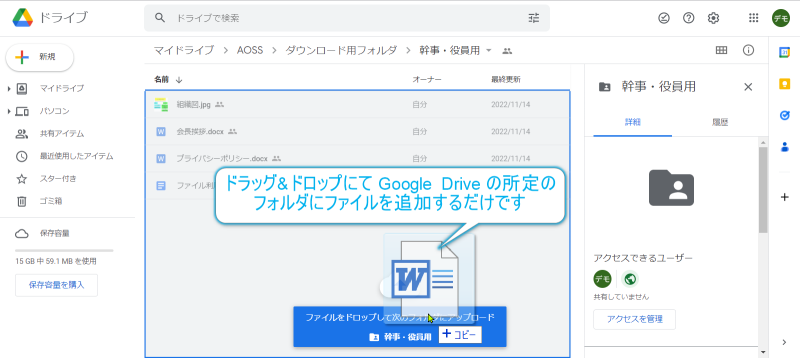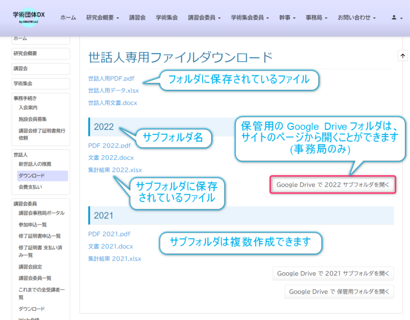 会員にファイルを配布することができるように、EMUYN 学術団体DXシステムでは、 Google Drive と連携したファイルダウンロードページを用意しています。