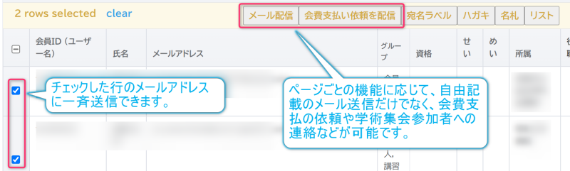 会員リストや学術集会参加登録者のリストなどのページから、共通の操作でメールを送信できます。
