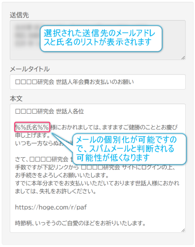 文面には、会員名などを挿入することができますので、 迷惑メールとして破棄される率を下げてより確実に連絡することが可能です。