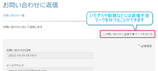 「この問い合わせに返信不要マークを付ける」ボタンは、いたずらや勧誘などに対して利用してください。