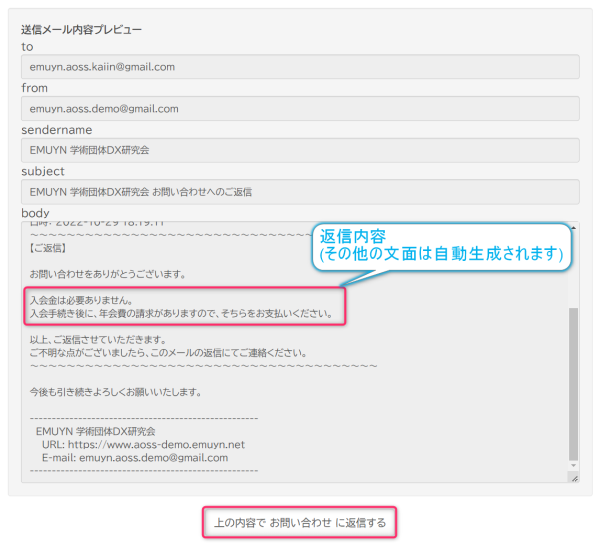 (返答を書き込んで問い合わせや申込み者に送信する)