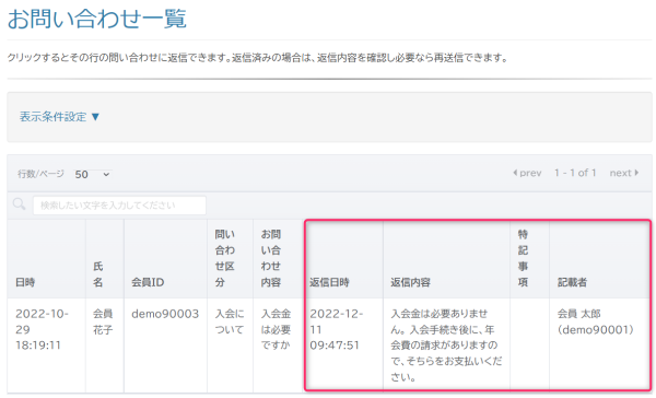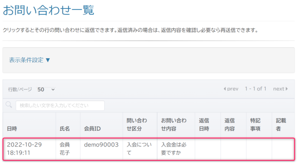 お問い合わせ一覧 を F5, CTRL+R(Win), CMD+R(Mac) でページの再読み込みをしていただくと、 先程の返信内容が登録されていることが確認できます。