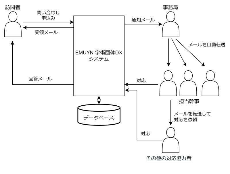 EMUYN 学術団体DXでは、 基本的な問い合わせや申込みをすべてウェブベースとし、 対応業務をできるだけわかりやすく、また複数の担当者が分散して対応できるように設計してあります。